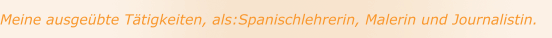 Als Spanischlehrerin, unterrichte ich seit1998 (Anfänger) bei den folgenden Grundschulen: Oberneuland. Horner. Carl Schurz und Staderstrasse. Für die Mittelstufe und fortgeschrittene gestaltete und leitete ich Spanisch-Sprachkurse bei der Bildungswerk der Gewerkscaft "DAG". Darüber hinaus erteile ich ständig Privaunterrricht.